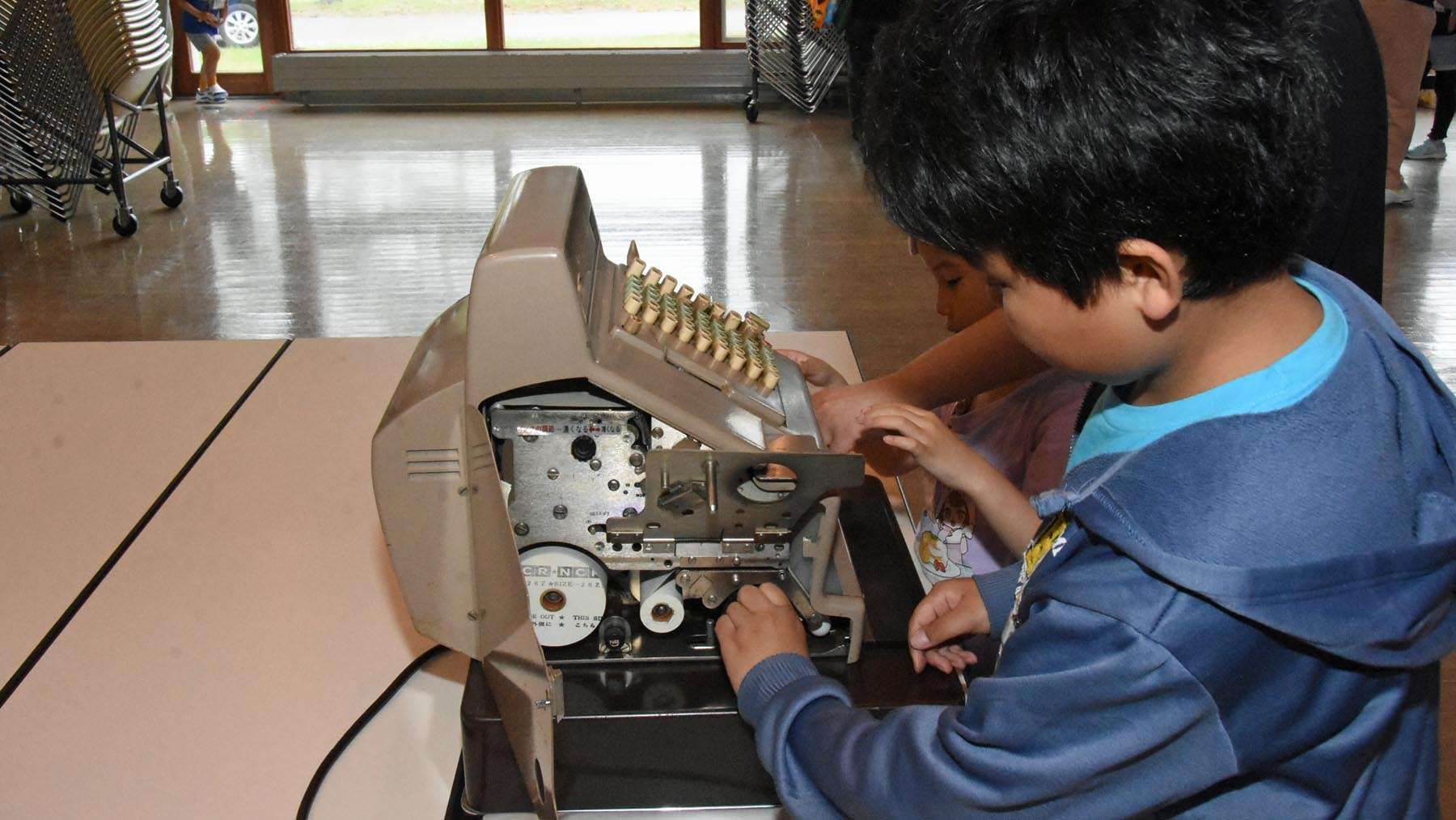 このほか、黒電話、かき氷機や和文タイプ、8ミリビデオやフィルムカメラなどなど、たくさんの昔のモノがたくさん並び、いじって試してみました。