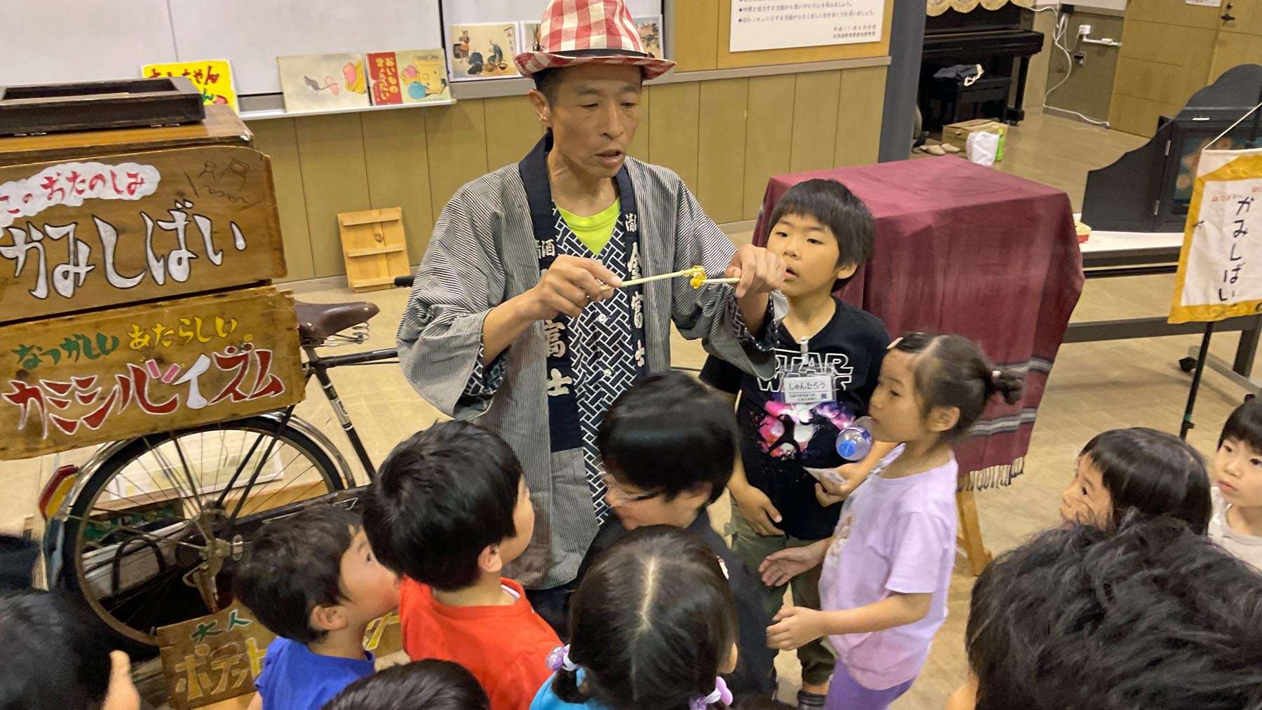 昔は、せんべいに水飴を挟んだおやつを買って、それを食べながら紙芝居を見ていました。このお菓子が、紙芝居屋さんの収入源・・・。