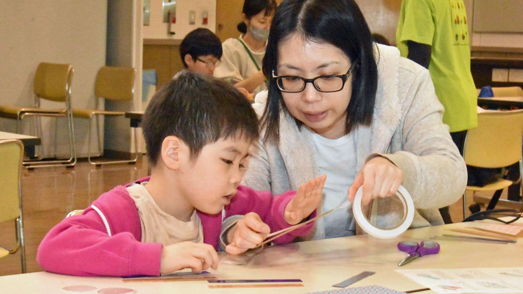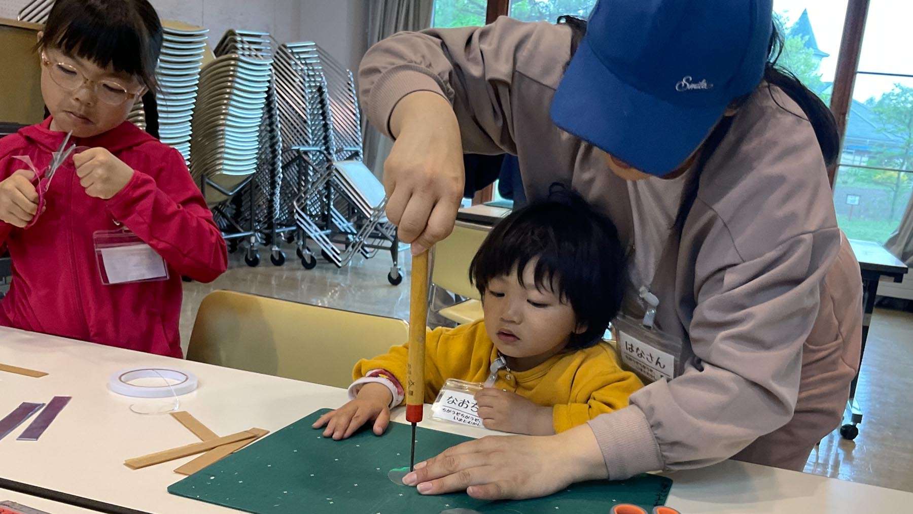 わかりやすい資料も配付して、家族ごとで万華鏡づくりが始まりました。