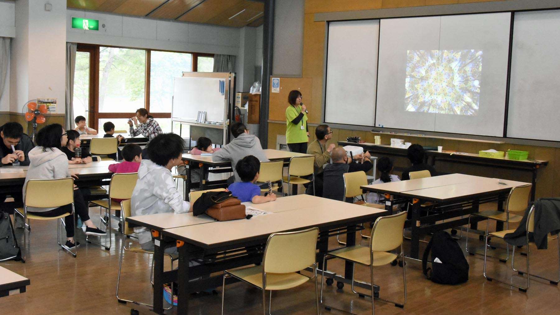 せっかく作った万華鏡がどのように見えているのか。みんなにも見てもらえるよう、プロジェクタで投影して、鑑賞会も行いました。