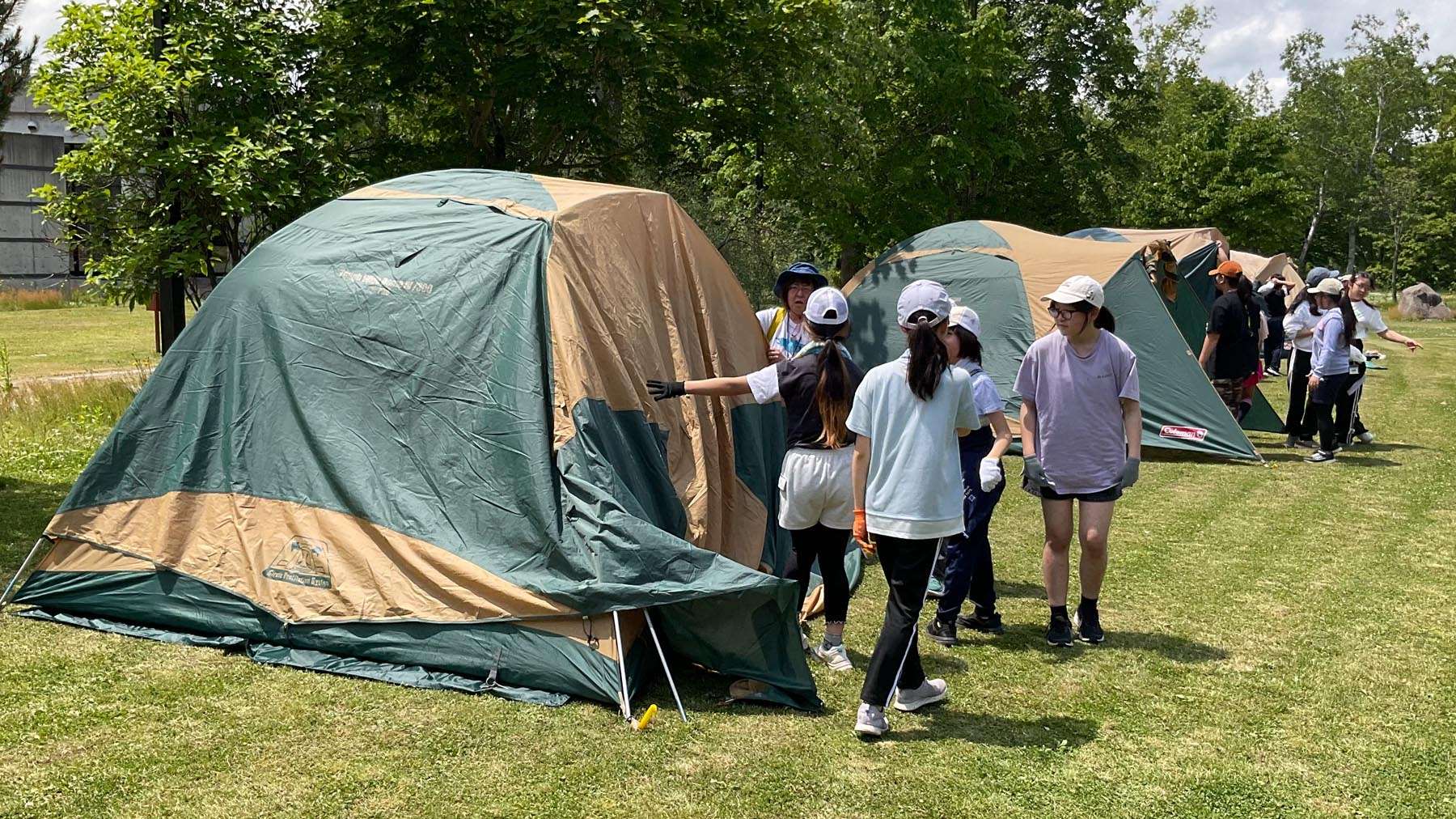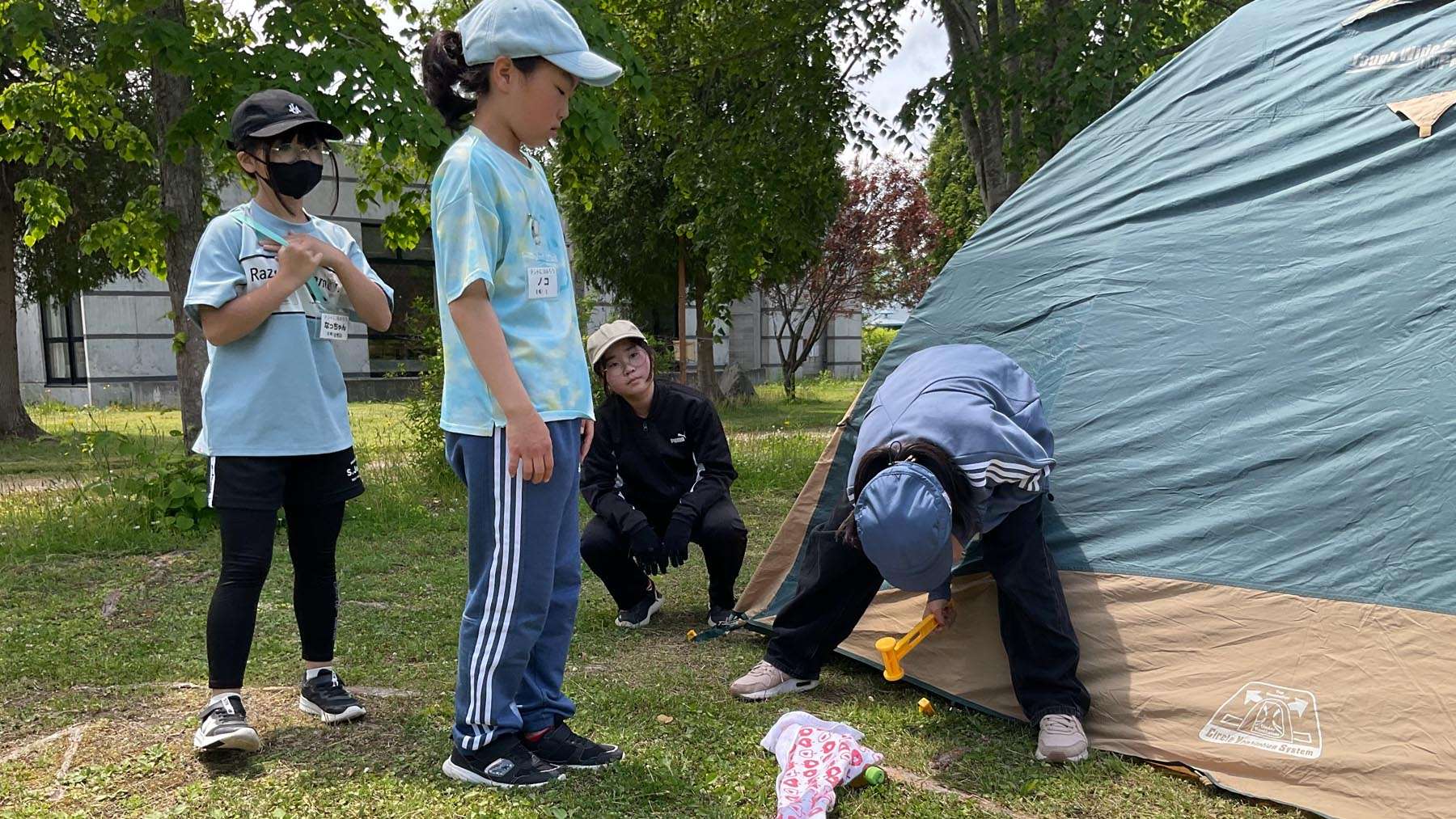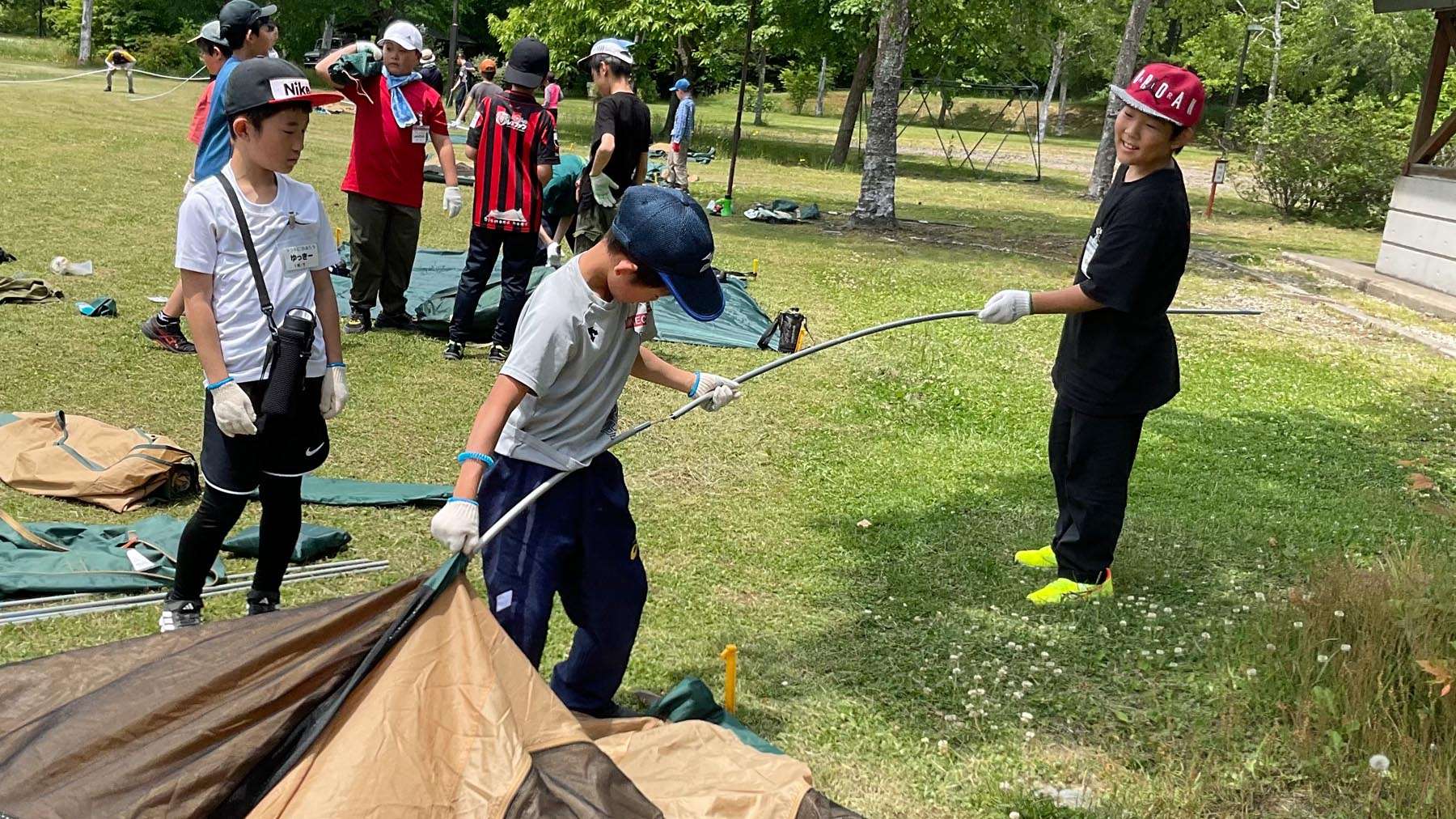 さて、令和7年度主催事業「テントにとまろう」は、開会式のあとテント設営が始まったことを前回お知らせしたところですが、その続きを・・・。