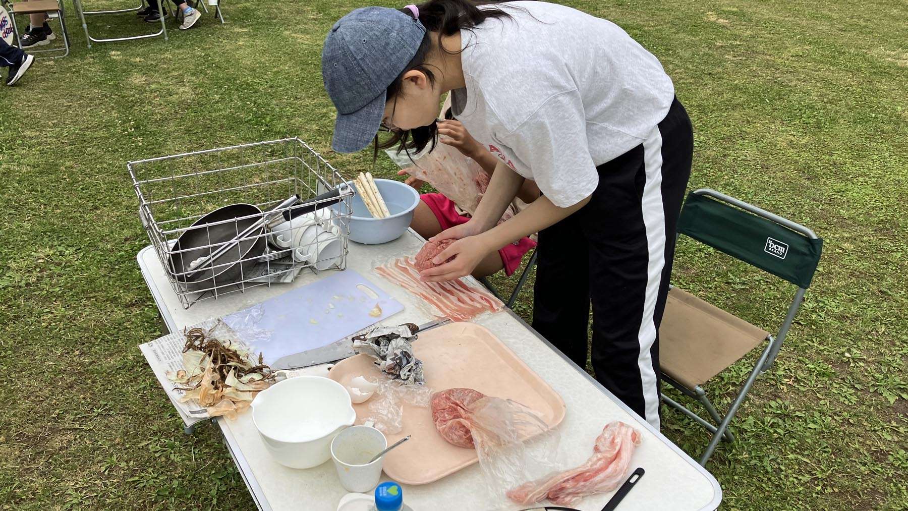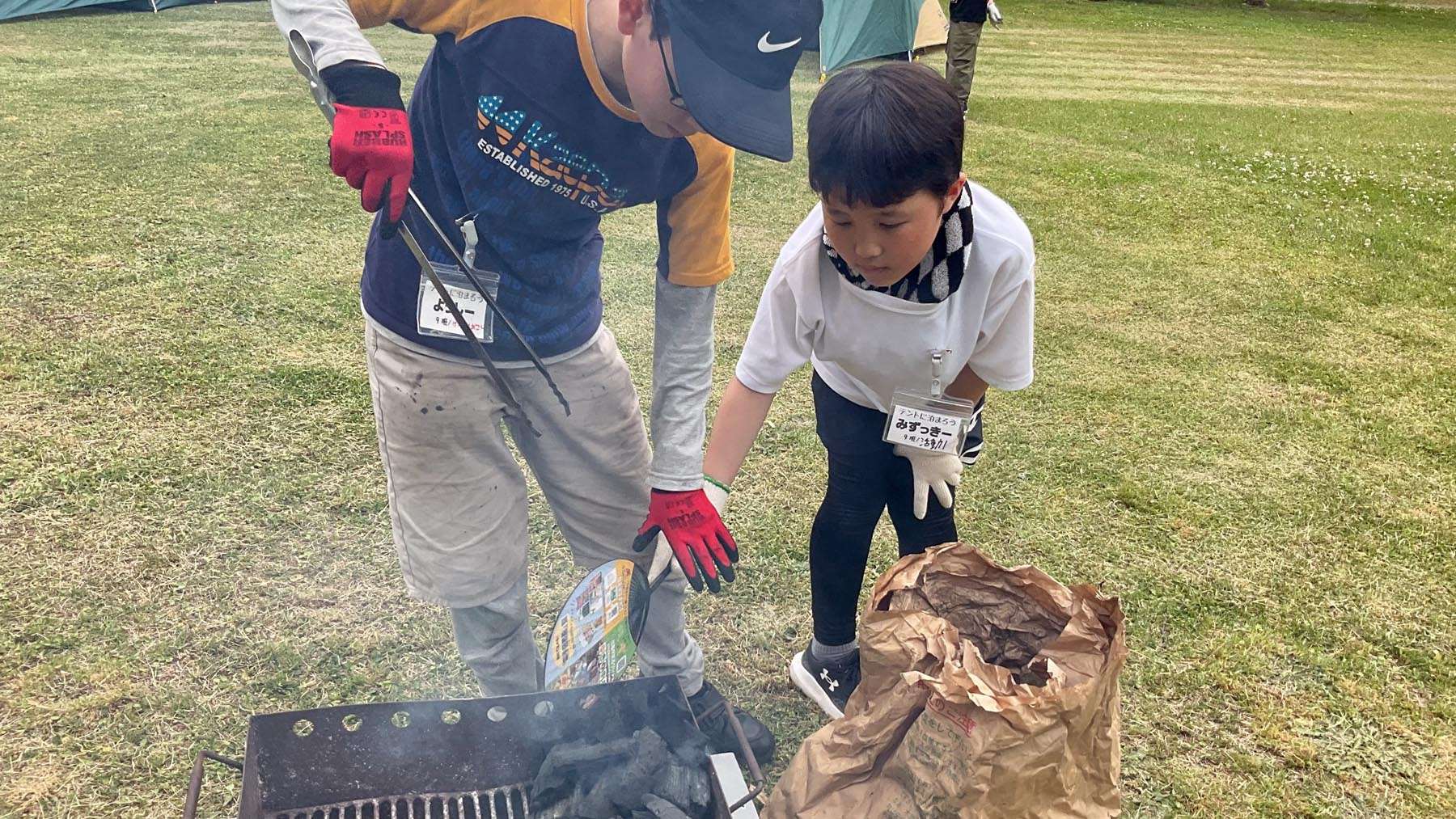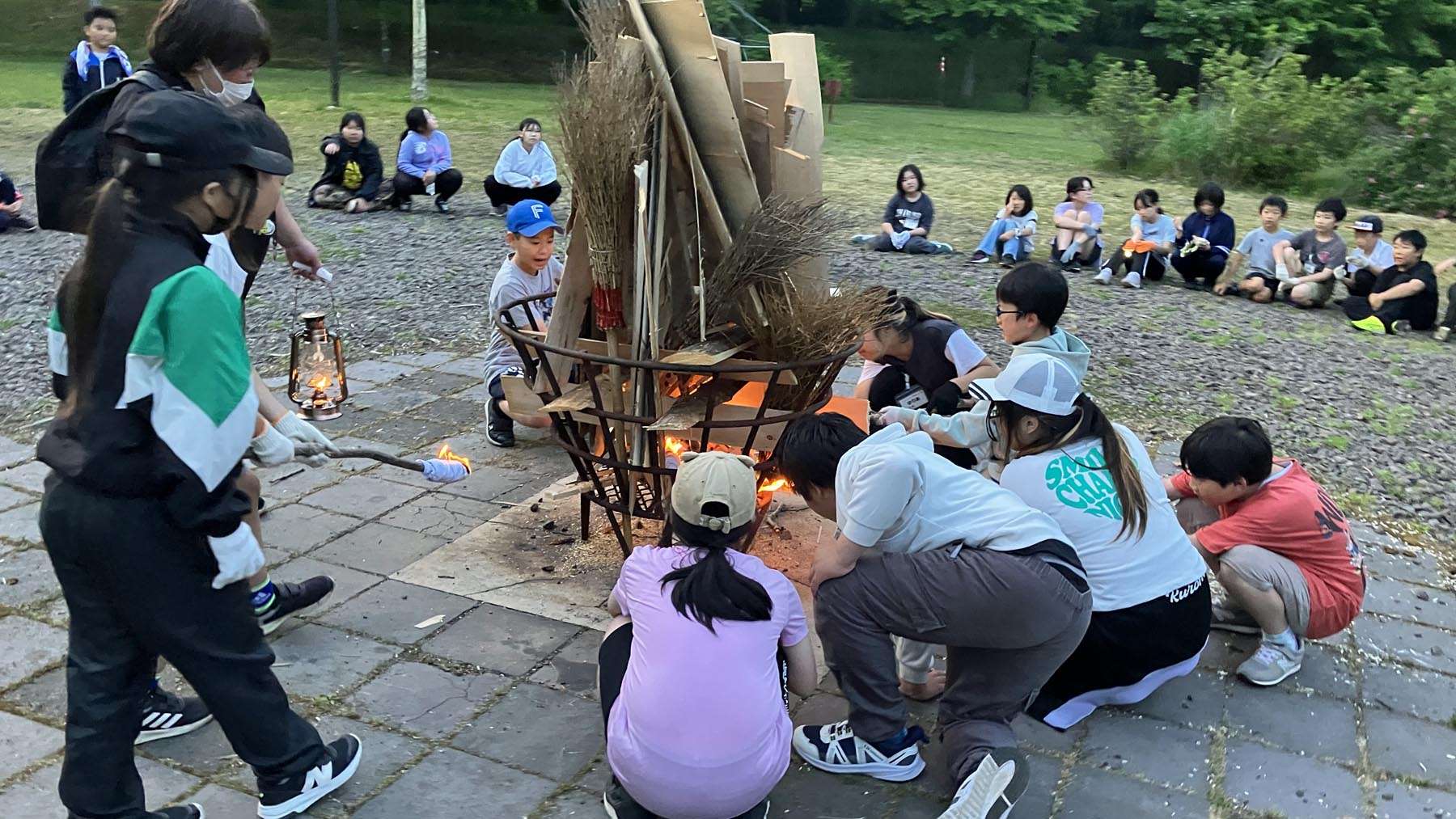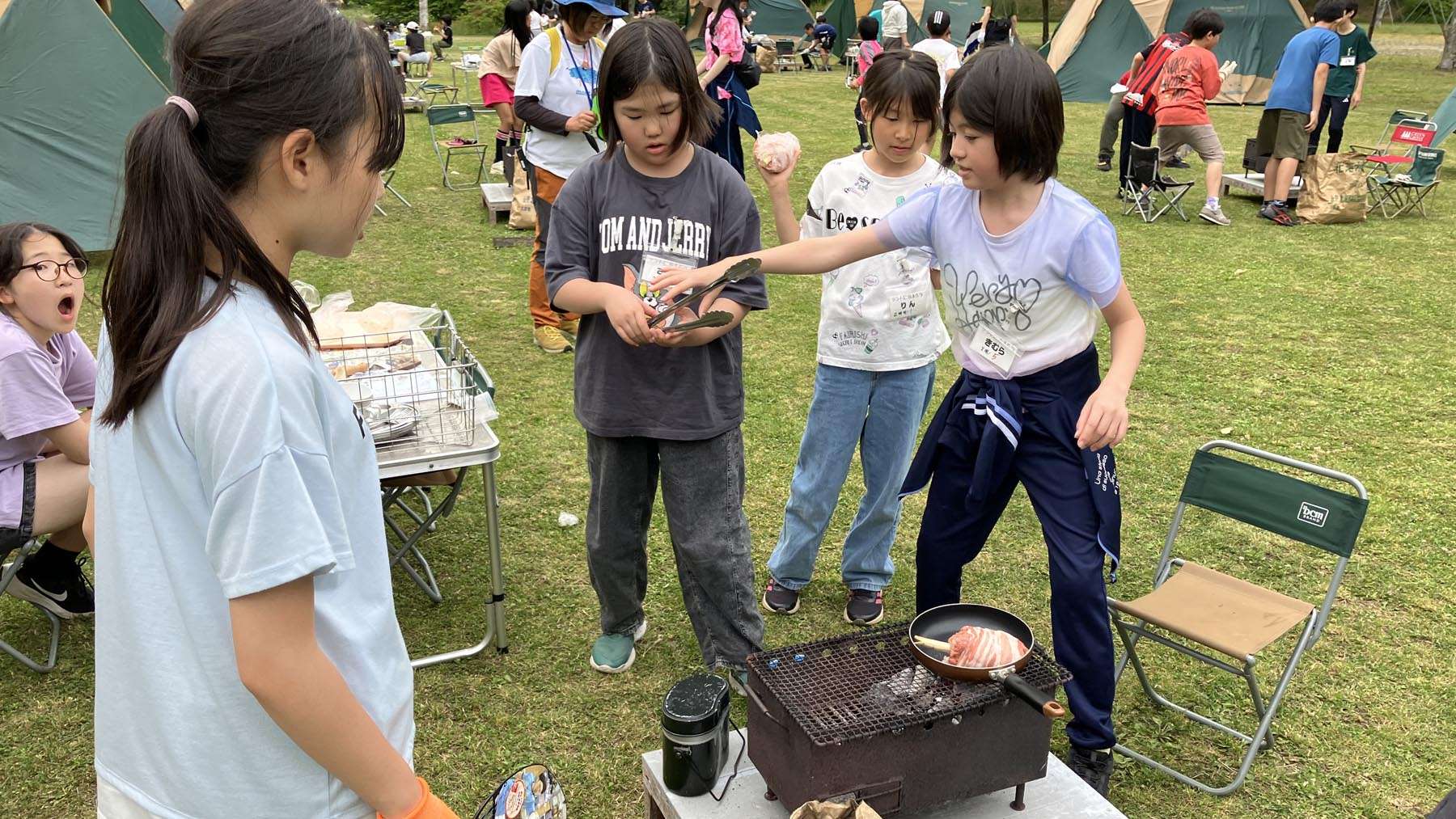 テント設営と火起こしを終えた、令和7年度「テントにとまろう」事業の1日目前半に続き、休憩のあと、「マンガ肉」づくりと「キャンプファイヤー」の後半に移ります。