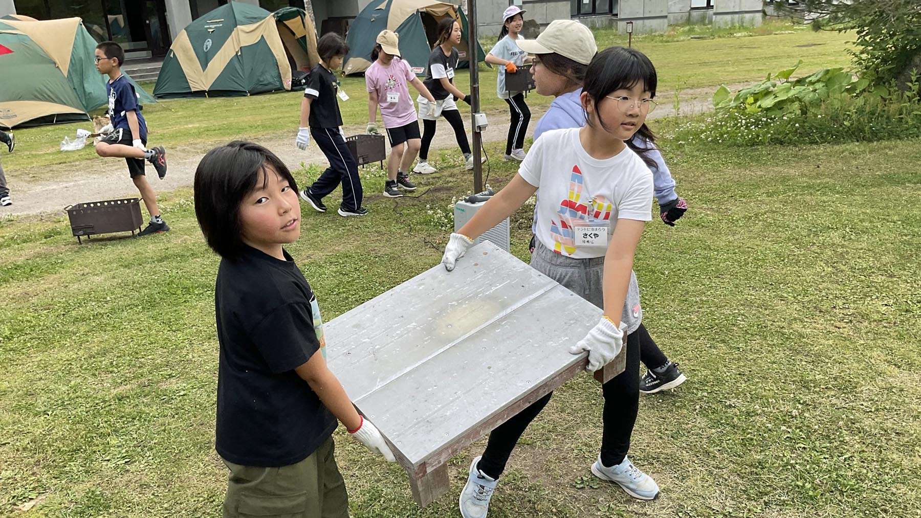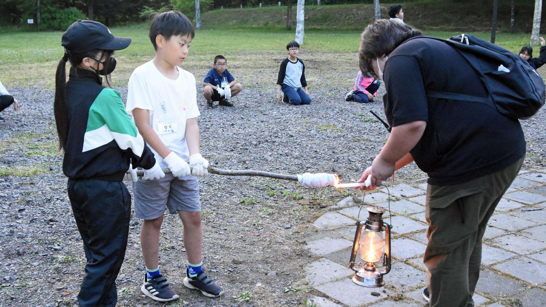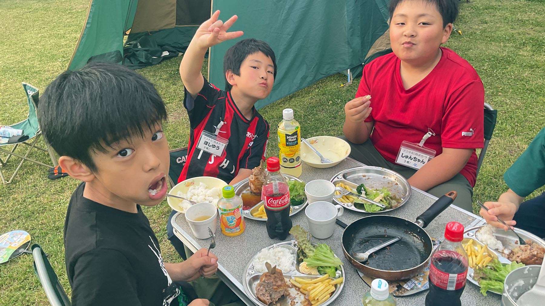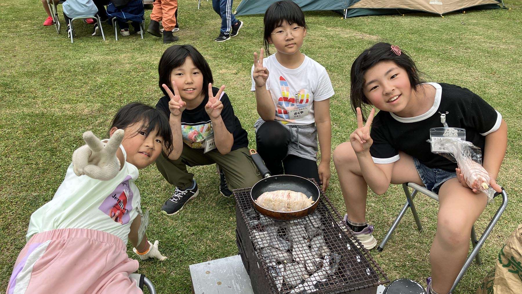 テント設営と火起こしを終えた、令和7年度「テントにとまろう」事業の1日目前半に続き、休憩のあと、「マンガ肉」づくりと「キャンプファイヤー」の後半に移ります。