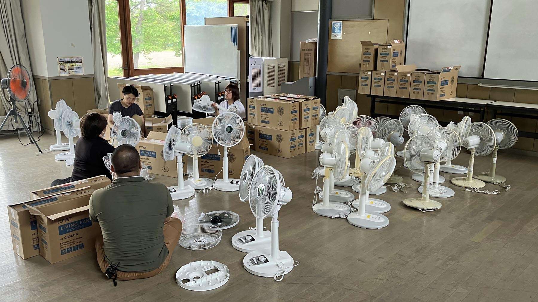 大量の扇風機と格闘する職員