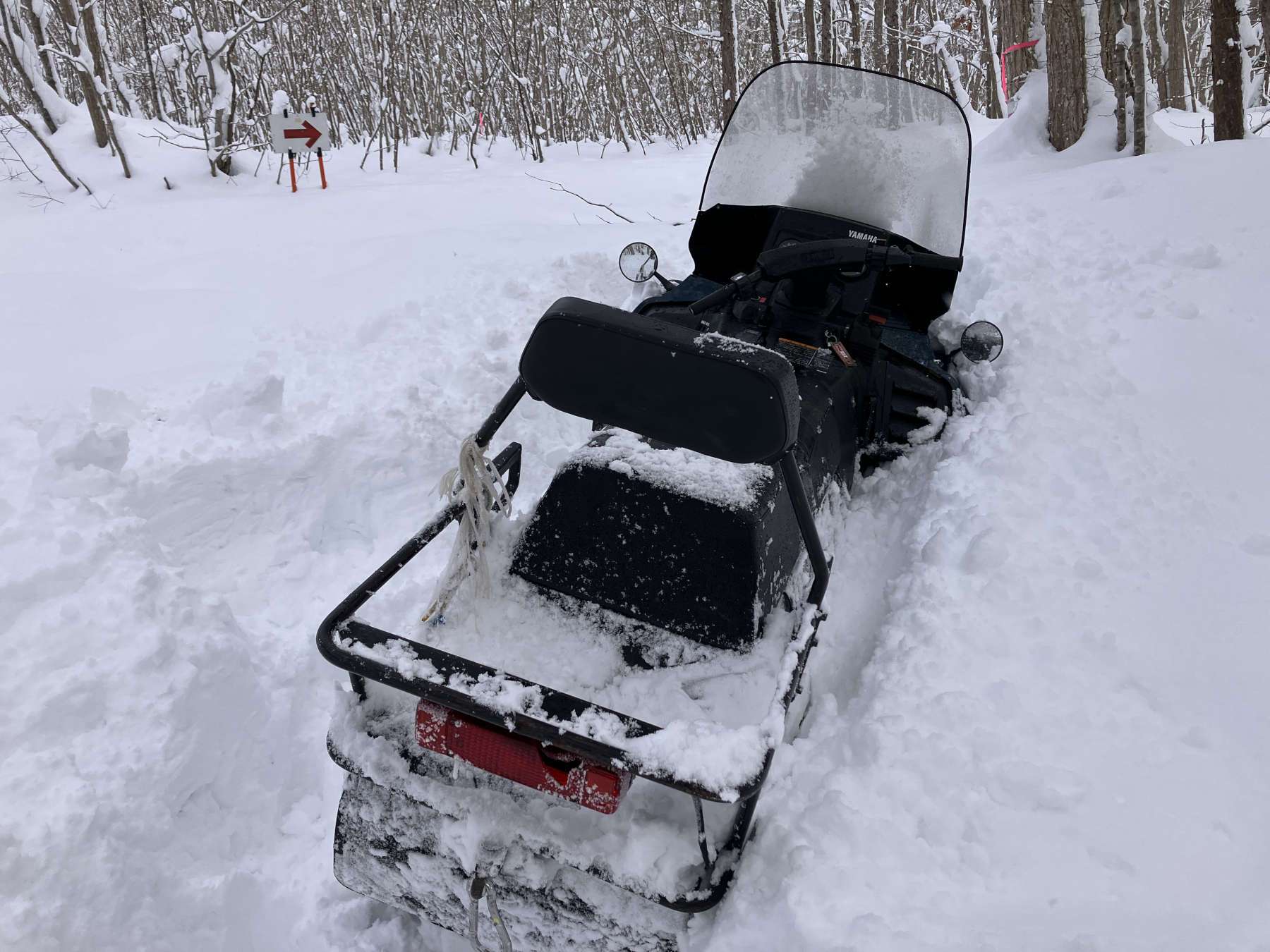 歩くスキーの林間コースに入ったスノーモービルは、あえなく埋まっちゃいました。